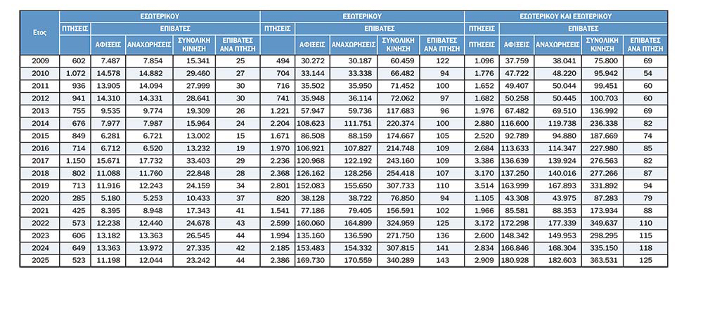 Η σύγκριση με την προηγούμενη δεκαετία δείχνει ακόμη πιο καθαρά τη δυναμική της διεθνούς κίνησης. Το 2015 οι επιβάτες ανά διεθνή πτήση ήταν 104,5, ενώ το 2025 έφτασαν τους 142,6. Η αύξηση είναι 38,1 επιβάτες ανά πτήση ή περίπου 36,4%.